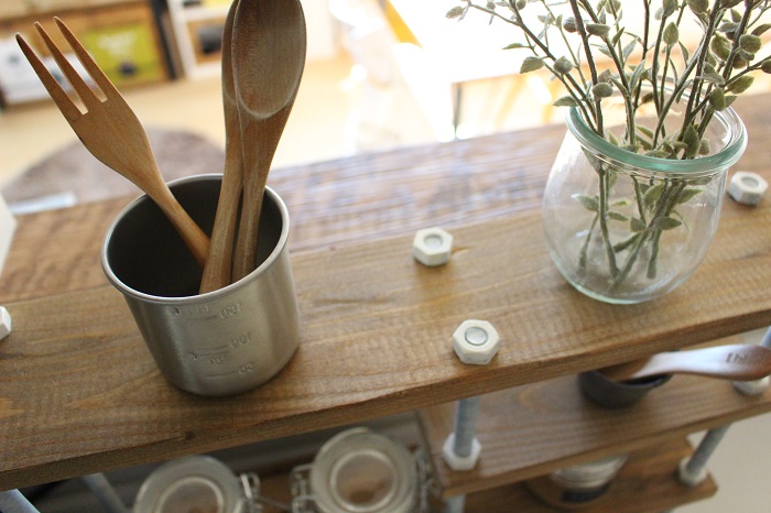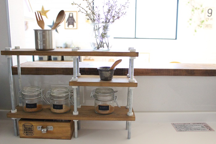 このシェルフは、キッチンアイテムをおしゃれに使いやすく収納したくて、作ってみましたよー。
