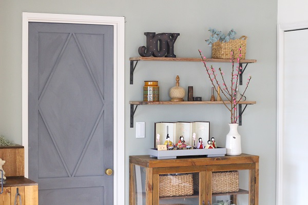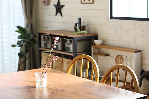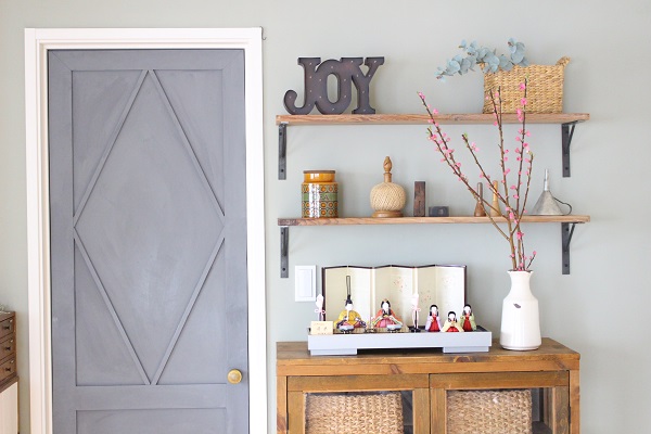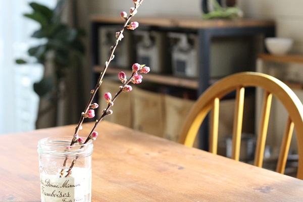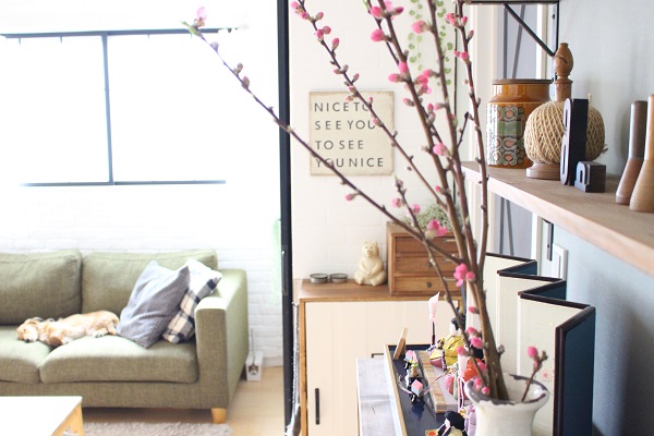 桃の花を飾ることで、「和」の要素である雛人形と、「洋」の要素が強い我が家のインテリアが、やんわりつながってくれる♡