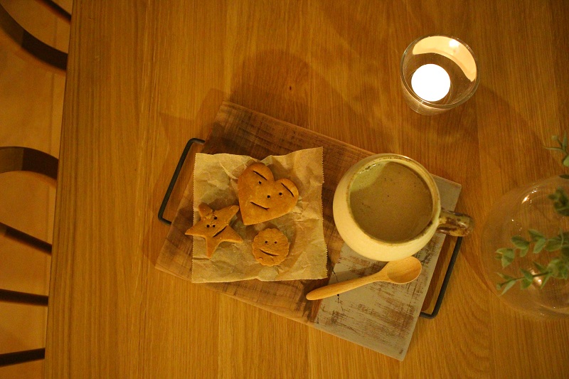 今朝は、昨日娘と一緒に作ったスマイルビスケットと、ほうじ茶ミルクティーをいただきました。