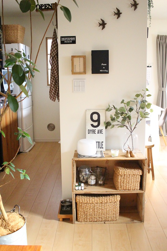 先日も記事にしましたが、リビングのフォーカルポイントとなる場所に、コンソールテーブル的なイメージで置いたりんご箱2つ。