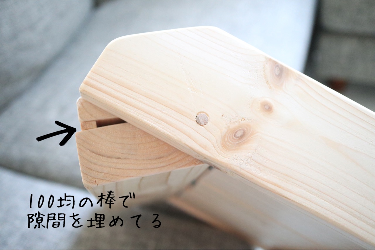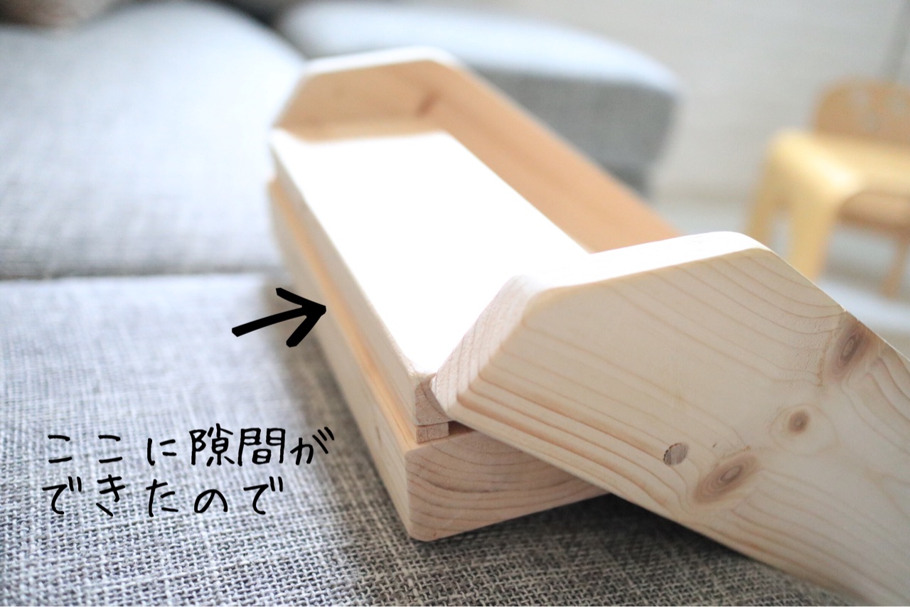 ツーバイフォーの上にワンバイフォーを重ねたところ、L字金具がある分隙間ができてしまって、ちょうど子供の指が入りそうな危ない感じの隙間だったので、