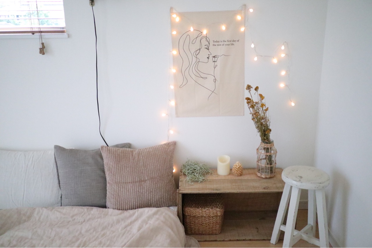 「低いベッド」というのが結構ポイントかなーと思ったので、寝室の一角を韓国インテリア風に。